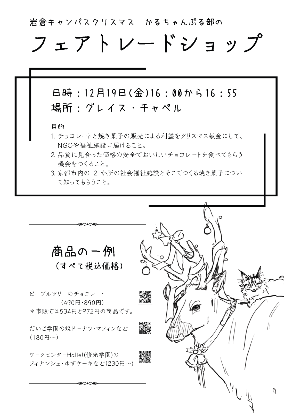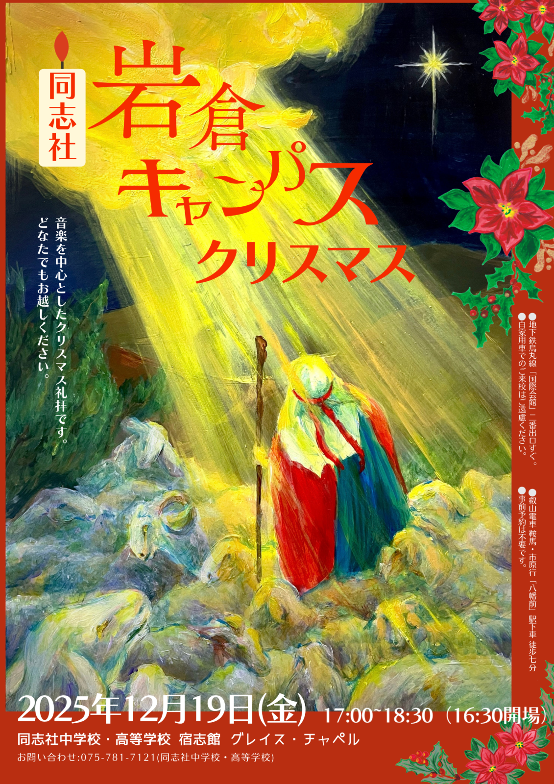 News & Informationニュース 2025.12.04 お知らせ 2025 同志社岩倉キャンパスクリスマス 2025年12月19日(金)17時~18時30分頃 場所:宿志館 グレイス・チャペル中高生の合唱やオーケストラとともにクリスマス燭火礼拝を行います。クリスマスの時期、ぜひ友人・ご家族らとともにご参加ください。