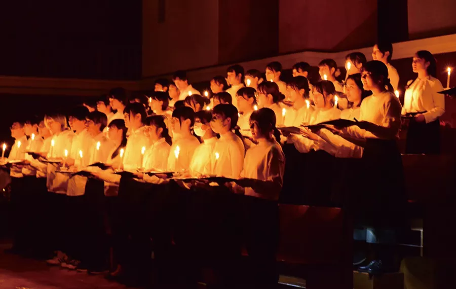 地域の方々も招き、チャペルで行う行事です。ホザナ・コーラス部や管弦楽部、宗教部などを中心に、聖歌隊やハンドベルの演奏、お祈りなどの式を生徒によって執り行います。